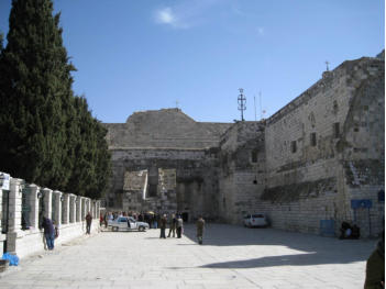 Blick vom Krippenplatz auf dem Eingang der Geburtskirche